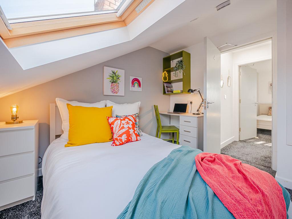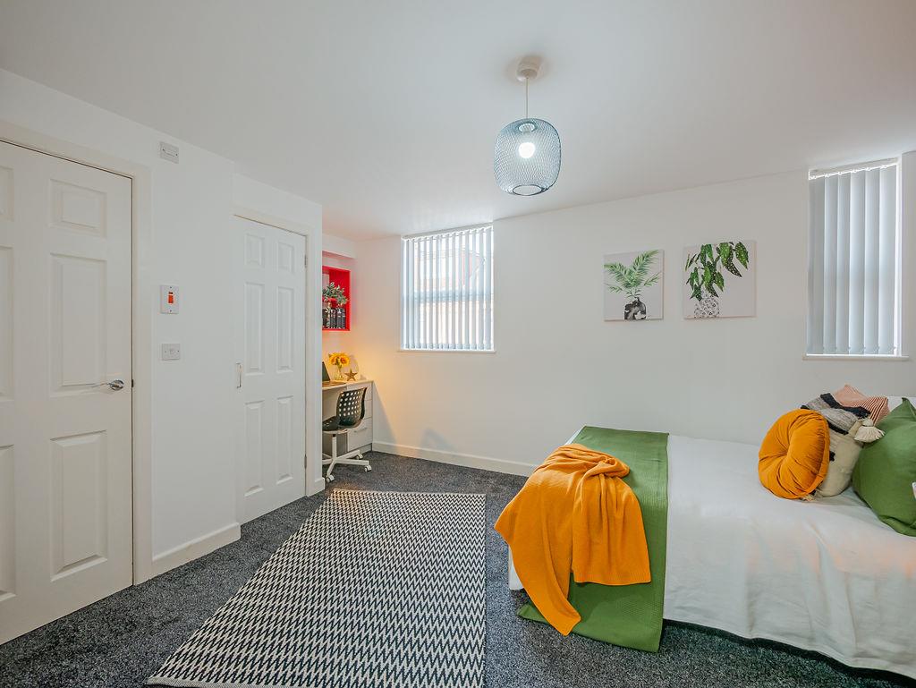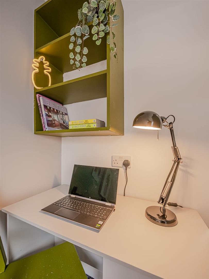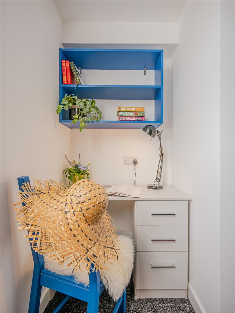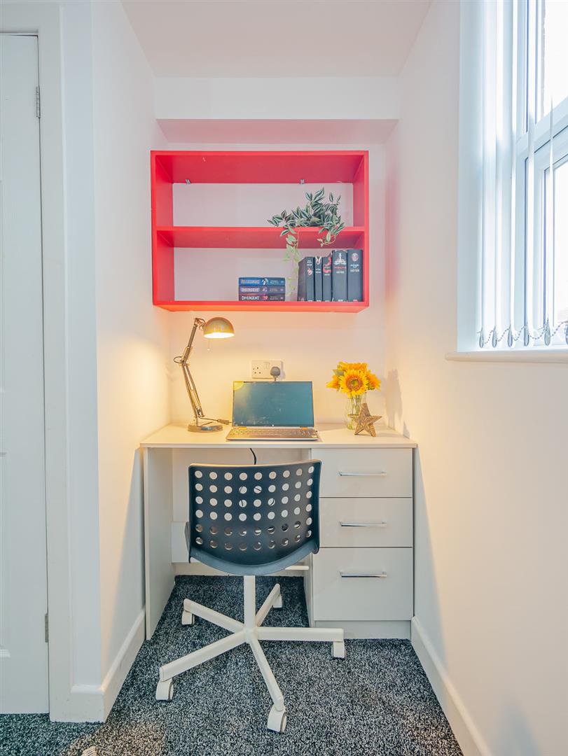 * The spacious double bedroom contains an en-suite shower room, double bed, wardrobe, and study area including a desk/chair & wall mounted TV
