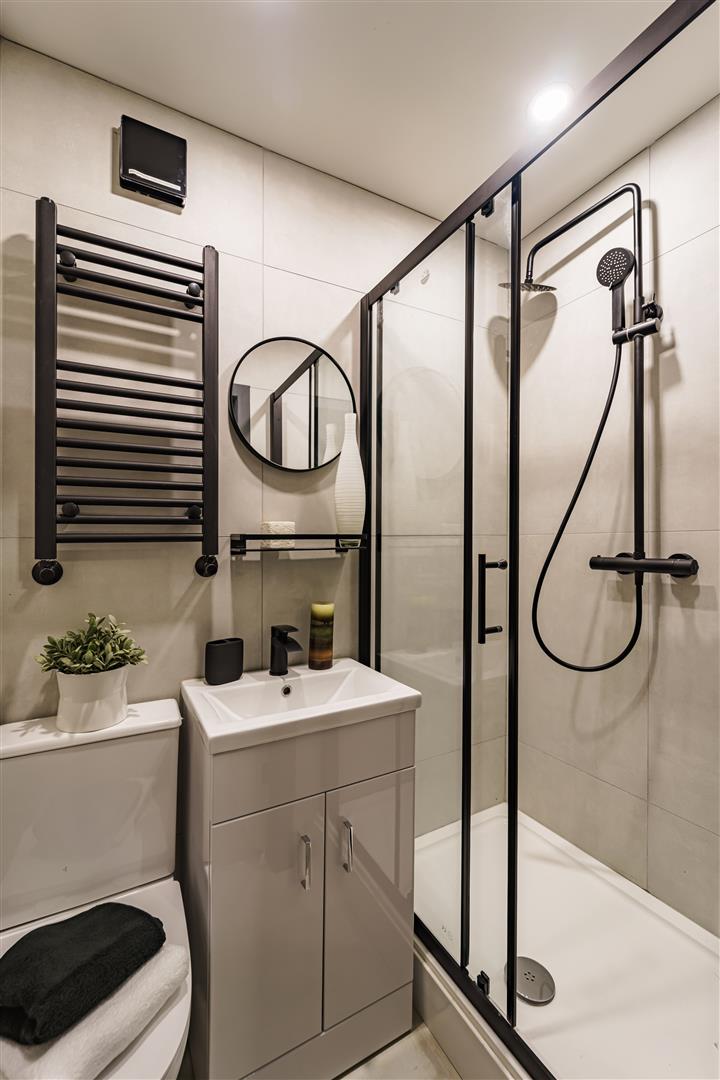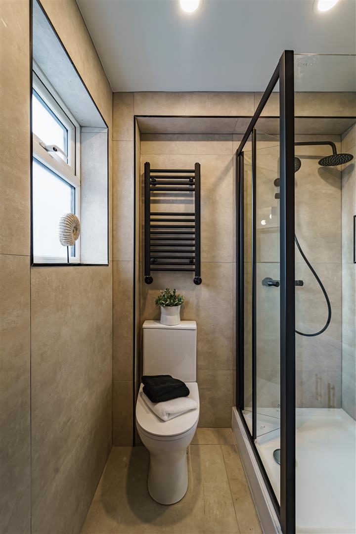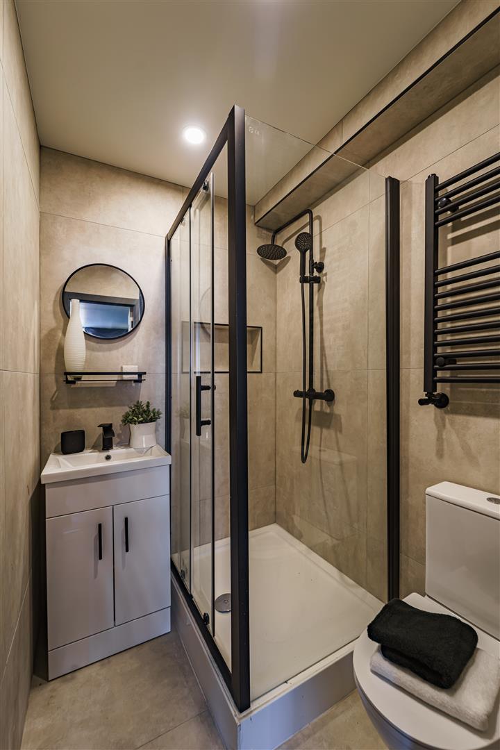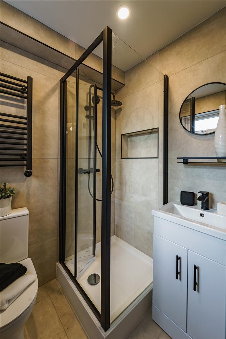 *Modern Shower Room with Elegant Tiling, Spacious Shower, Sink & WC