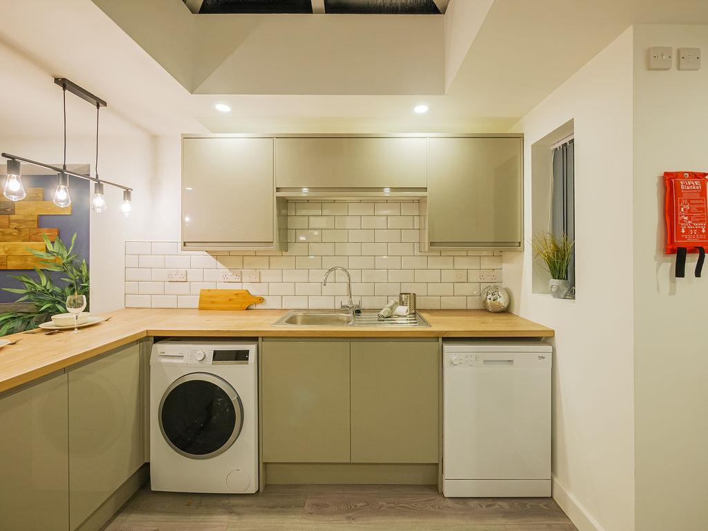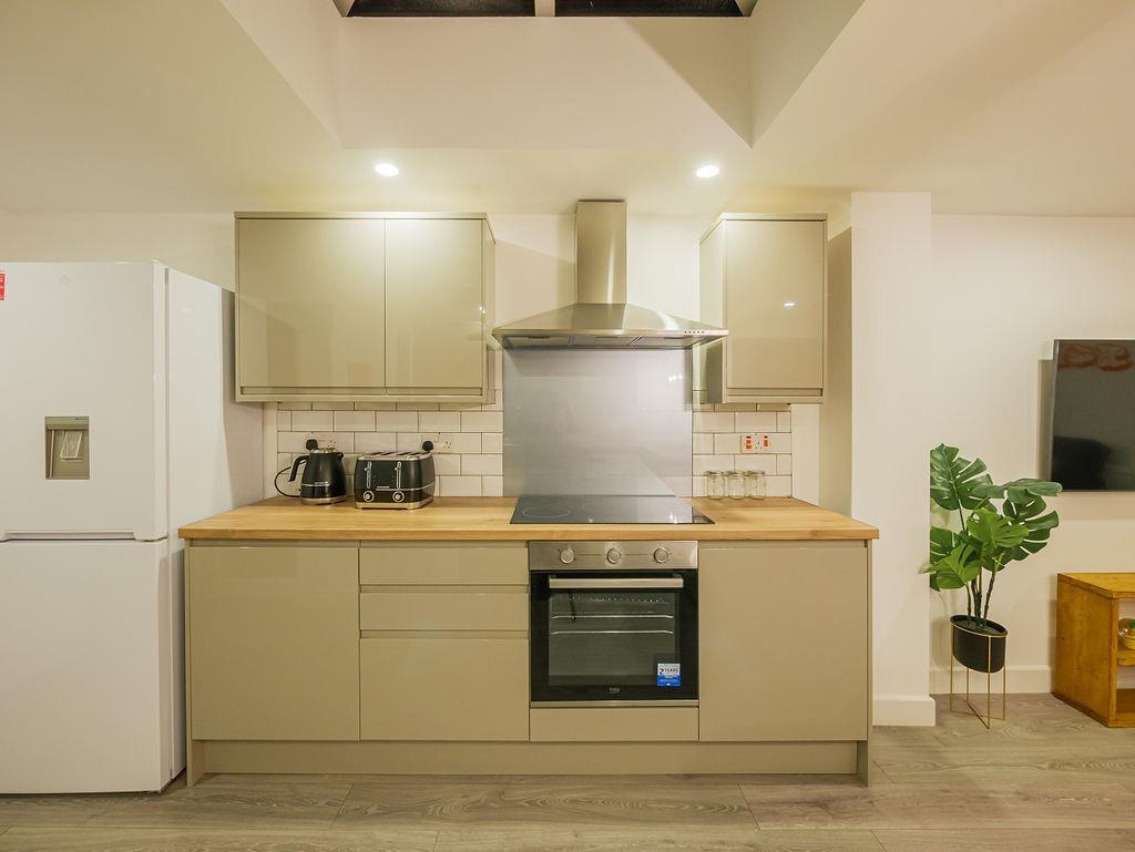 * Large open plan kitchen / living area which is well equipped with appliances, storage space, a large cooker & breakfast bar.