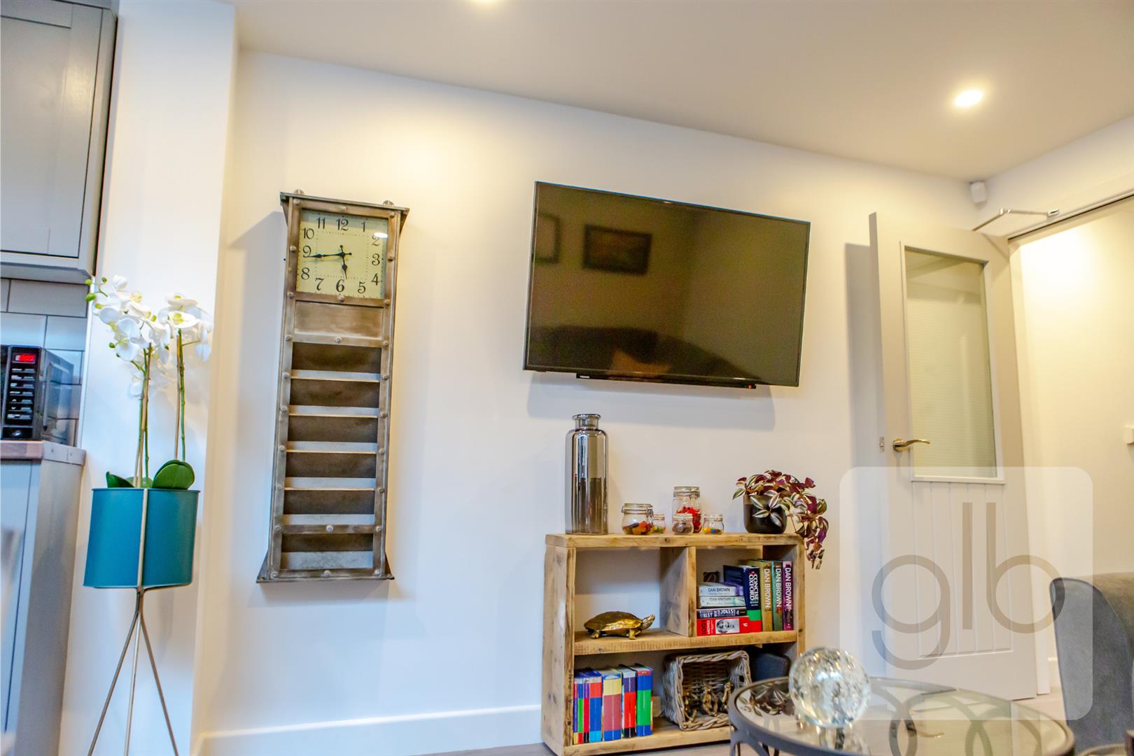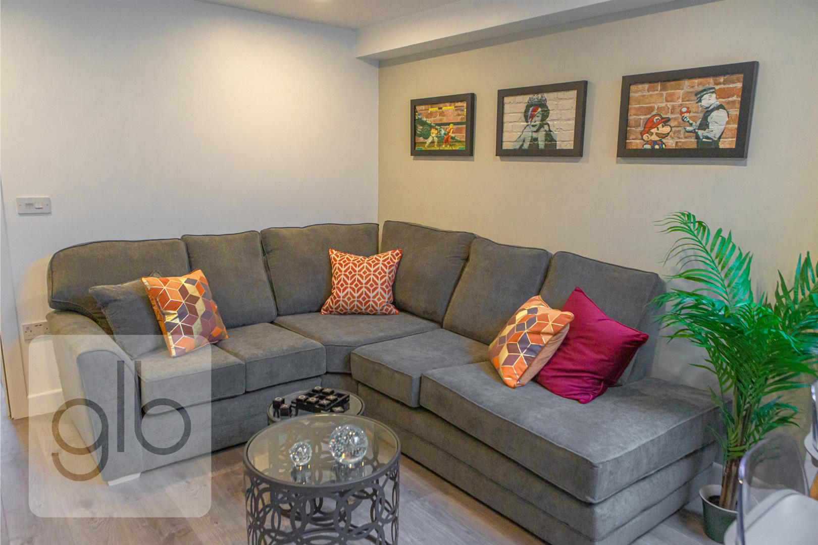 * The living area incorporates well with the kitchen for socialising and entertaining housemates and friends with a large corner sofa and wall mounted TV