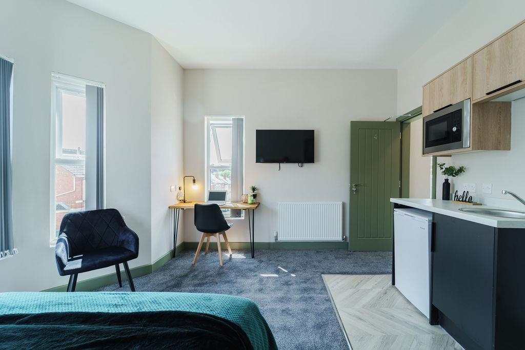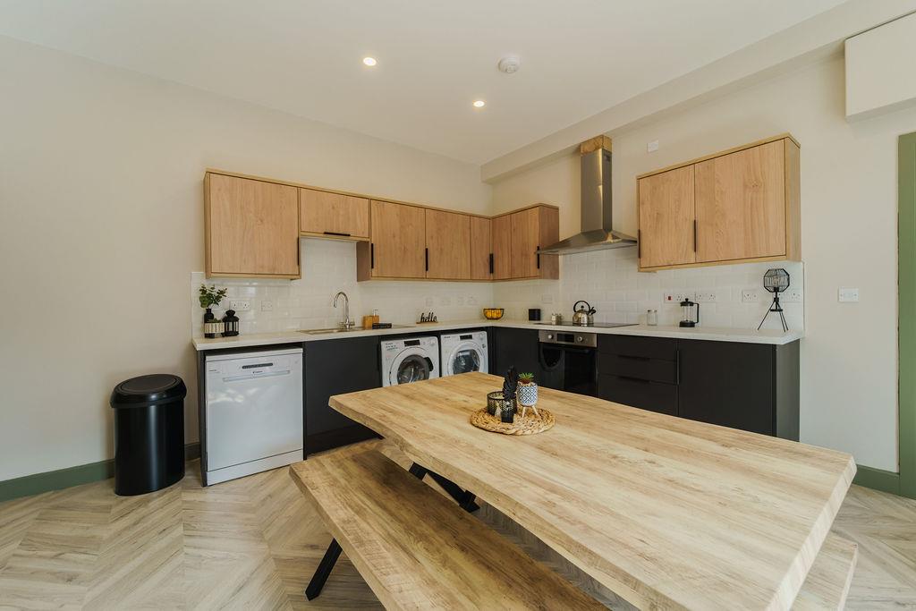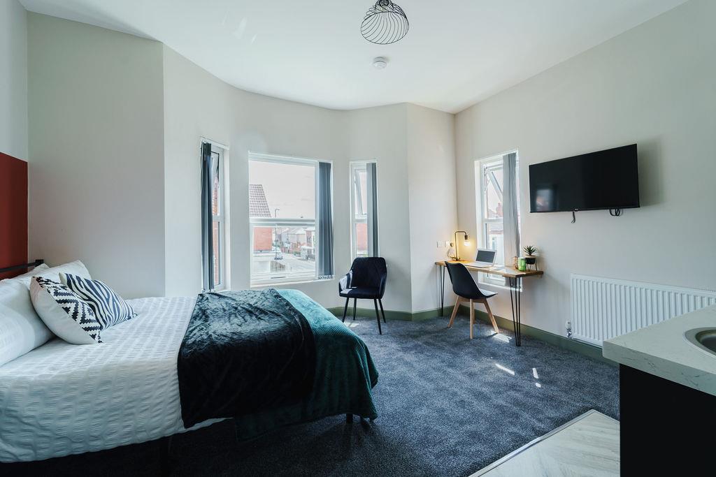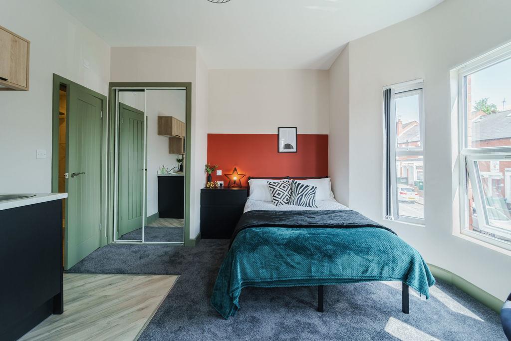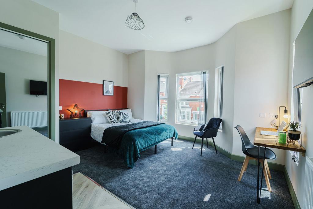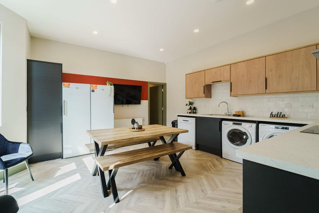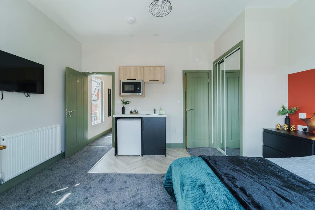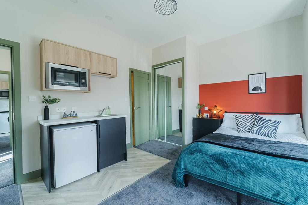 The lux-suites have been designed to really appreciate and utilise the space exceptionally well, cleverly creating a subtle dividing bed/living area space. Main communal kitchen includes a hob and oven as well as a washing machine, tumble dryer, dishwasher, fridge/freezer, a lovely little lounge area with sofa, coffee table and TV, as well as a desk for all your study or work requirements. The shower room has a wonderfully modern tile design with a spacious shower, sink & toilet. The lux-suite comes fully furnished to a high standard throughout.